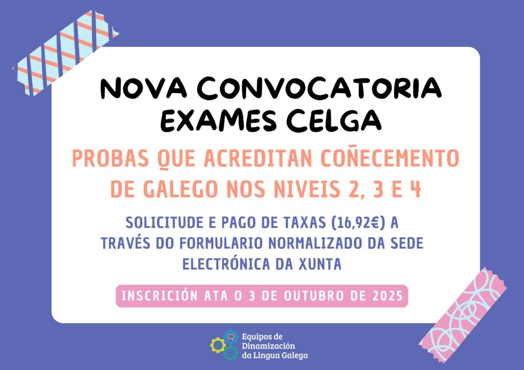 Nova convocatoria de exames Celga!! As persoas interesadas nas probas que acreditan o coñecemento do galego nos niveis 2, 3 e 4, poderán inscribirse ata o 3 de outubro. A súa realización está prevista para a segunda quincena de novembro en Santiago de Compostela. Tanto as solicitudes como o xustificante de pagamento das taxas (16,92 […]